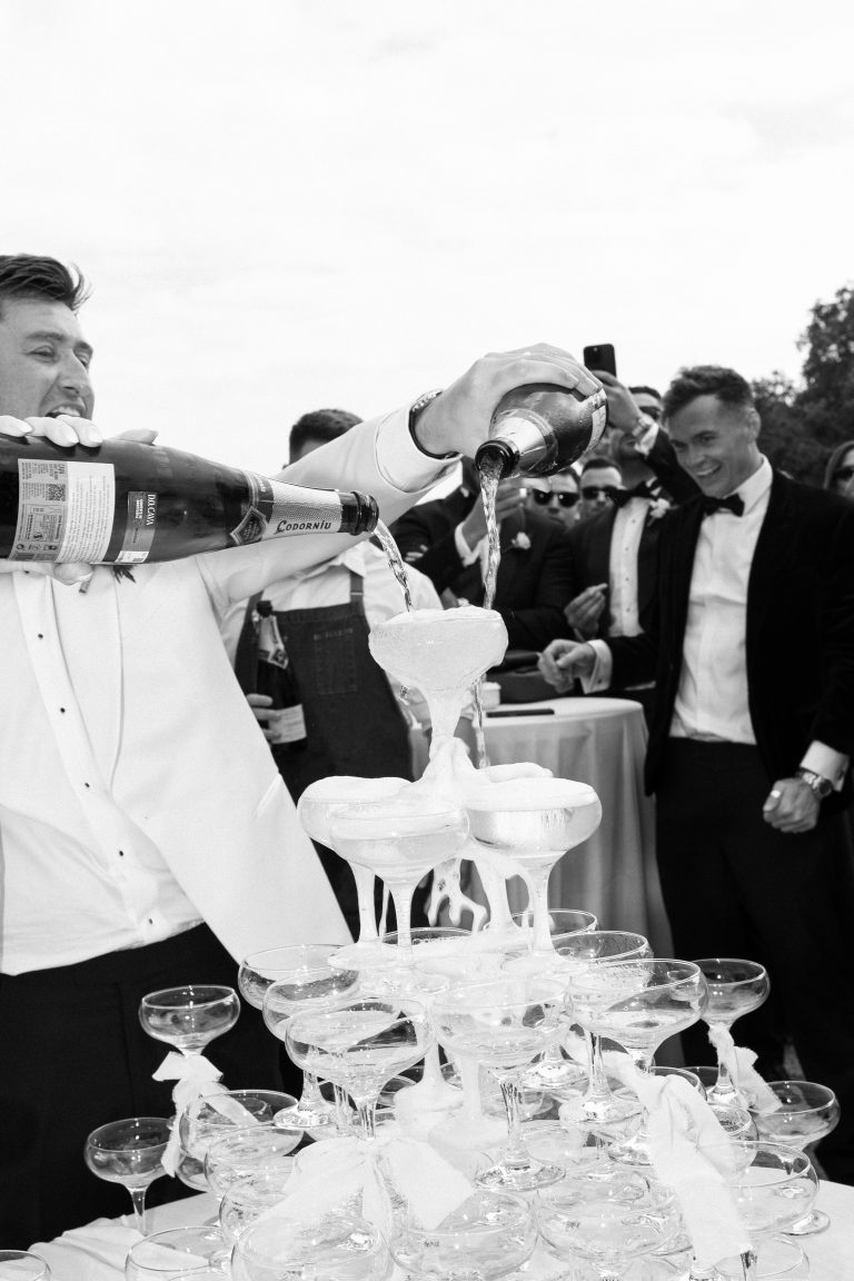 Fue una boda con un ambiente espectacular, marcado por un dress code muy cuidado: invitados elegantísimos, ellos con esmoquin, y una celebración que combinó emoción y fiesta desde el primer momento. Uno de los grandes protagonistas del día fue una champagne tower brutal, un momento icónico que encendió aún más la celebración y dio paso a un auténtico fiestón.
